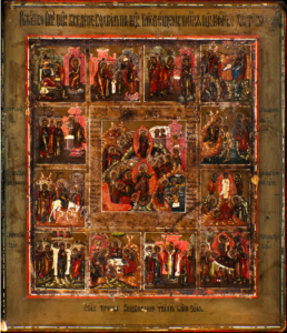 Like the Western European audiences who viewed Old Master paintings, so the Byzantine and later Greeks and Russians were largely illiterate, relying on the pictures at church for scriptural understanding and church teachings. An icon like this one would have been made personally for the home of the devout. In a traditional Russian home, families would place their icons on a special shelf in a corner, known as the “beautiful corner.” By including an icon of the annual feasts in the display, every day would be lived in light of Christ’s victory over sin, Satan, and death.
