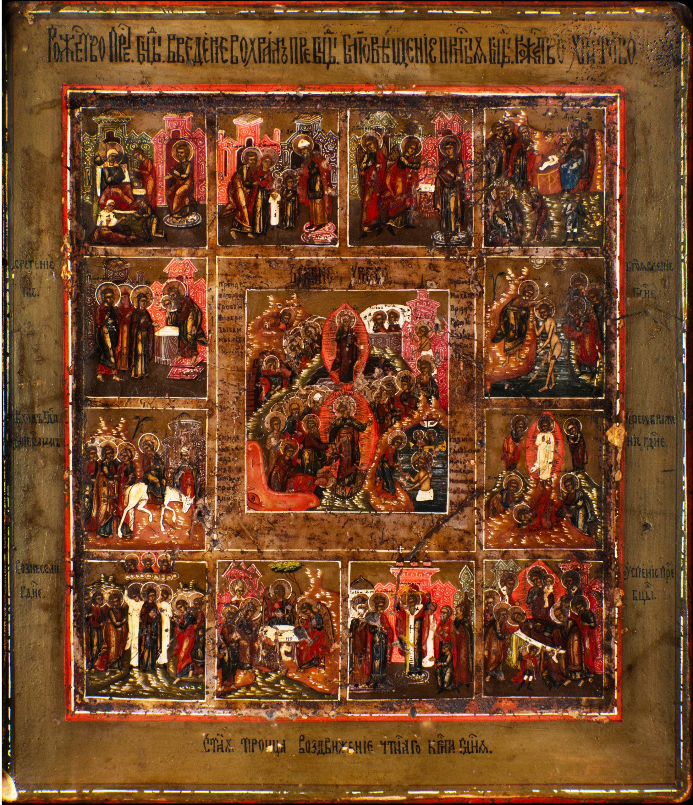 Finally, the centerpiece features the victorious, resurrected Christ, which is celebrated on Easter Sunday. All of the other feasts lead up to or follow this great event. Additionally, the central image includes a number of elements from the Harrowing of Hell as described in the apocryphal book of Nicodemus (part II).