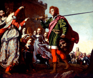 In this scene, however, Vignali manipulates these common characteristics to create a “restrained” but equally dramatic effect. For example, the composition is “crowded” but the poses elegant, the figures without distortion. The coloration is vivid but not garish, carefully integrated to create focus and highlight the triumphant mood of the scene (e.g., David’s bright red stockings draw the eye to Goliath’s head while the bright red sleeves of the woman’s costume create an implied horizontal line that guides the viewer’s eye back to the hero’s face).