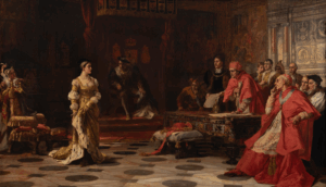 The painting dramatizes the nobility of Catherine of Aragon. She holds her skirt as if she has just risen from kneeling and is preparing to leave after she finishes confronting those from church and state who would declare her marriage of twenty-four years to Henry VIII void—namely, Cardinal Wolsey (standing at the table) and the pope’s emissary, Cardinal Lorenzo Campeggio (seated).