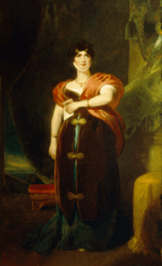Here, Pott conflates two parts of the historical telling into one scene. According to the eyewitness account of Cardinal Wolsey’s gentleman-usher and biographer George Cavendish, Catherine was called to appear before the Legatine Court at Blackfriars where Henry sat upon a canopied dais to watch. Rather than addressing the court, which she felt would legitimize their purpose, she made a rational and impassioned appeal on knee to her seated husband only, then arose, curtsied to the king, and left the hall. The council summoned her to return, but she refused on the grounds that they had already decided against her. Cavendish recounts that later Wolsey met with Catherine for further discussion; however, she strongly and loudly rebuked him for his action motivated by political ambition.